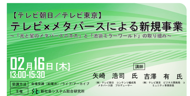 今回はテレビとメタバースが完全連動する地上波番組「新世界 メタバースTV!!」の事例をはじめ、これまでテレビ朝日が挑戦してきた「テレビ×メタバース」戦略について、具体事例を交えながら説明をいたします。