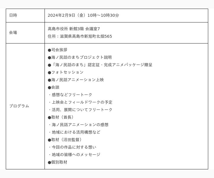 日時:2024年2月9日(金)10時~10時30分 場所:高島市役所 新館3階 会議室7