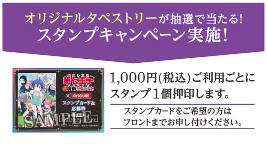 また、コラボドリンクご注文でお渡しするスタンプカードに、カラオケご利用金額1,000 円(税込)ごとにもらえるスタンプを5つ集めて応募すると、オリジナルタペストリーが抽選で5名様に当たるスタンプキャンペーンも実施します!