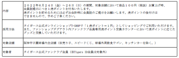 阪神電気鉄道株式会社(本社:大阪市福島区、社長:秦雅夫)が運営する阪神甲子園球場では、2022年6月24日(金)~6月26日(日)のJERA セ・リーグ公式戦対中日戦において、グッズショップを含む阪神甲子園球場内各売店で商品をお買い求めいただき、お会計時に阪神タイガース公式ファンクラブ会員証をご提示いただくと、虎ポイントをプレゼントいたします。