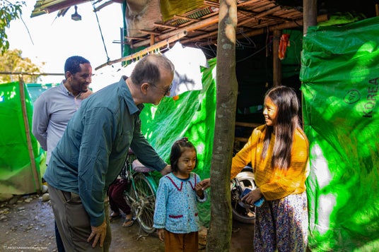 カチン州にあるシャマリ国内避難民キャンプを訪れ、避難民の子どもたちと話すユニセフのチャイバン事務局次長(ミャンマー、2024年11月14日撮影)(C) UNICEF/UNI684948/Maung Nya