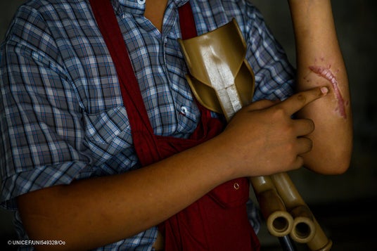 2023年12月上旬、バゴー地域で家業の米作りを手伝っていた時に、誤って地雷を踏んでしまい、爆発で重症を負った15歳のアウンさん。救命治療のため、左足を切断しなければならなかった (ミャンマー、2024年3月19日撮影) (c) UNICEF/UNI549328/Oo