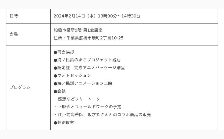 一般社団法人日本昔ばなし協会と日本財団が取り組む「海ノ民話のまちプロジェクト」は、日本中に残された海にまつわる民話を発掘し、その民話のストーリーとその民話に込められた「想い」「警鐘」「教訓」を、親しみやすいアニメーションとして映像化する事業です。この度、千葉県船橋市を舞台にした海ノ民話アニメーション「雪どけ塚の白ヘビ」が完成したため、2月14日(水)にアニメ監督が船橋市を訪問し、アニメのお披露目と「海ノ民話のまち」認定式を実施しました。このイベントは、次世代へ豊かで美しい海を引き継ぐために、海を介して人と人とがつながる“日本財団「海と日本プロジェクト」”の一環で実施しています。