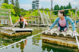 水上アスレチック『wonder amembo』は人気動画クリエイターのフィッシャーズが監修したエリアの1つで、場内の池を利用したアスレチックです。水上に設置された30ポイントのアスレチックは難易度も「カンタン」から「激ムズ」まで様々に設定しています。「跳べ!ぷかぷかアイランド」はロープを用いてジャンプし、タイミングよくロープを離すことで浮島に渡ることが出来ます。「一寸法師の気分」は桶の中に入って水面を進みます。