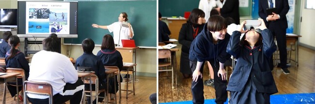 ダイバーとしてギネス記録をもち、水中生物とコミュニケーションを取りながら世界の海で水族表現家として活動する二木あいさんが魚と一緒に泳ぐシーンの映像が、前後左右360°VRでゴーグルを通して子どもたちの目の前に広がります。自分たちが知っていたふくと、実際に海の中にいるふくの違いや、海の課題を知って感じたことを、映像を通して想いを巡らせていました。