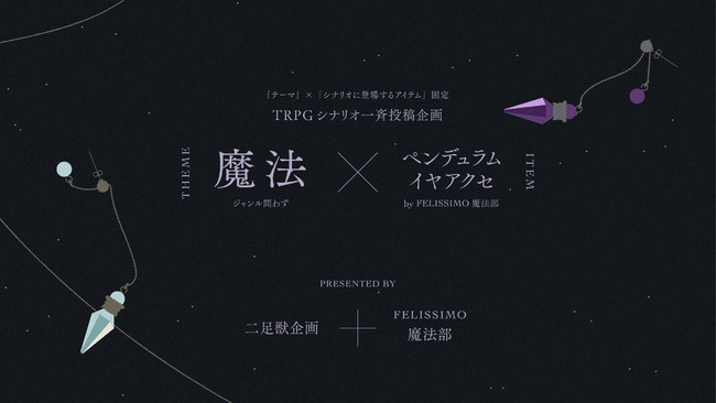 フェリシモが展開する部活動「魔法部(R)」は、TRPGシナリオ一斉投稿企画「きっと魔法遣いだったあなたたちへ」を3月1日に発表、特設サイトを公開し、公式Twitterアカウント運用開始しています。TRPG企画主催の先駆者である「二足獣企画」とのコラボ開催です。シナリオのテーマは“魔法”、シナリオ内に必ず魔法部の商品「魔法部ペンデュラムピアス」を登場させることが条件です。制作されたTRPGシナリオは8月8日~8月14日期間中にTwitterにてハッシュタグをつけて公開予定です。詳細は特設サイトや公式Twitterアカウントでチェックできます。