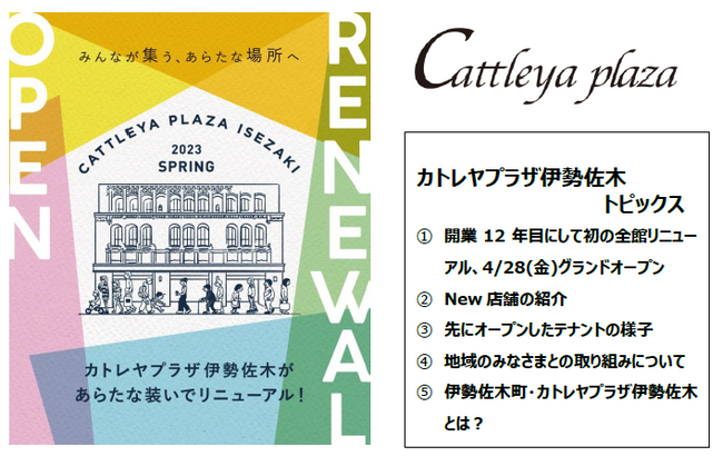 株式会社パルコ(本部:東京都渋谷区)が運営する横浜市中区伊勢佐木町の「カトレヤプラザ伊勢佐木」は2023年4月28日(金)に残る最後のテナント「ユニクロ」のオープンに伴い、3月1日以降順次オープンしてきた改装リニューアルがいよいよグランドオープンを迎えます。