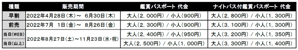 ※ナイトパス付鑑賞パスポートは有料会場への入場と、夜間作品を期間限定で公開する「ひかりの森~夜の芸術散歩~」会場への入場がセットになったパスポートです。「ひかりの森~夜の芸術散歩~」は9月23日(金・祝)~11月23日(水・祝)の土日祝、17:00~20:00の限定開催となります。ご鑑賞にはナイトパス付鑑賞パスポートまたはナイトパス(大人1,600円 / 小人800円)が必要です。