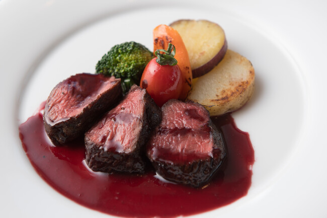 岐阜・谷汲の豊かな自然で鹿をはじめ、すべて天然の「ぎふジビエ」を自らで狩猟し、捕獲から解体、精肉加工に至るまで自社で一貫して行う<里山きさら>。厳選した鹿のもも肉を低温調理でしっとりと、ロゼ色に仕上げた鹿のステーキは、鹿肉の旨味が凝縮されています。ソースは鹿の骨から丁寧に取り出したスープを使用し、一体感のある赤ワインソースに。「ジビエ」が気になっていた方、実際に食べたことがない方にもおすすめな一品です。