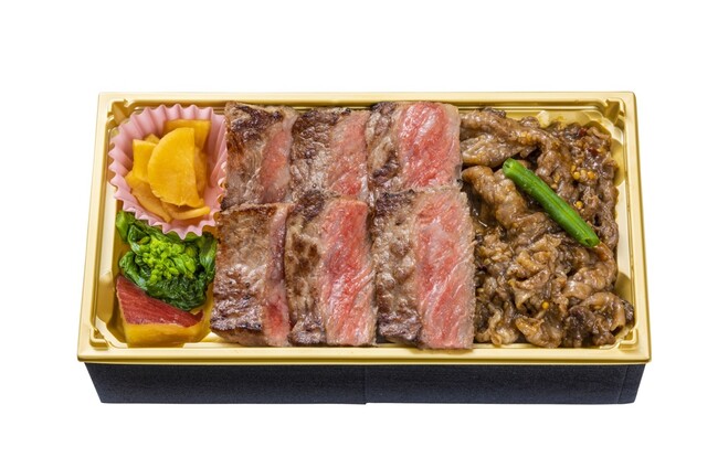 自社牧場で肥育した鹿児島県産黒毛和牛を使用したお弁当は、タレを絡めた焼肉と、柔らかく旨みが濃厚なサーロインのステーキが入った贅沢なお弁当です。