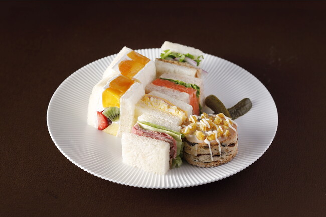 下段は、季節のフレッシュフルーツを詰め込んだ 『季節の特製フルーツサンドウィッチ』 のほか、バラエティに富んだ4種のサンドウィッチ、さらには丁寧に焼き上げられた紅茶との相性も抜群の 『マロンスコーン』 まで大満足のボリュームでご用意しました。