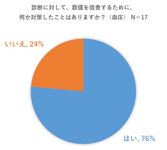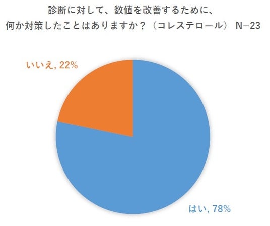 数値の高さを指摘された人の中で、改善するために何か「対策した」と答えた人は、高血圧は76%、コレステロールは78%。どちらも放置してしまうと重篤な病気につながる恐れがあり、7割の人が対策をしているようです。