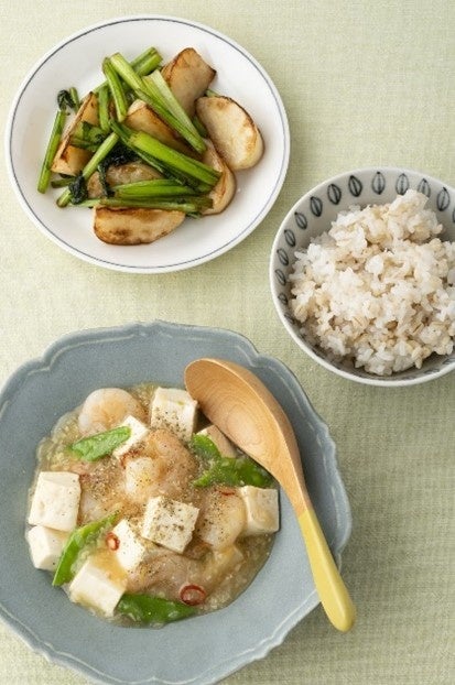 マーボーの辛みづけは塩分のないとうがらしやさんしょうで。塩分2.5g以下におさえた「とうふとえびの和風塩マーボー献立」。(『簡単おいしい大人の健康ごはん 高血圧を改善する献立と食べ方』より)