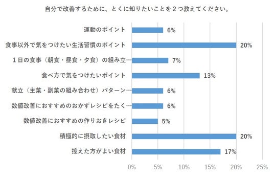 「自分で改善するために、とくに知りたいこと」としては、「積極的に摂取したい食材」20%、「生活習慣のポイント」20%、「控えた方がよい食材」17%など、自分ですぐに実践できる食事や生活習慣の知識が求められていることが分かる結果となりました。