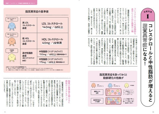 「積極的にとりたいもの」「控えたいもの」など、毎日の食事で気をつけたいことを紹介。「高血圧」は、おいしく減塩すること。「コレステロール」は、糖質・脂質を控えながら、食物繊維やたんぱく質をとることが、数値改善のカギになります。