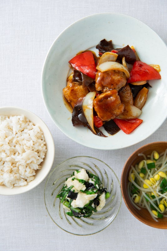 薄切り豚肉を使い、揚げずに焼くことで脂質をオフ。黒酢のコクで食べごたえ十分の「黒酢酢豚献立」。(『簡単おいしい大人の健康ごはん コレステロールを下げる献立と食べ方』より)