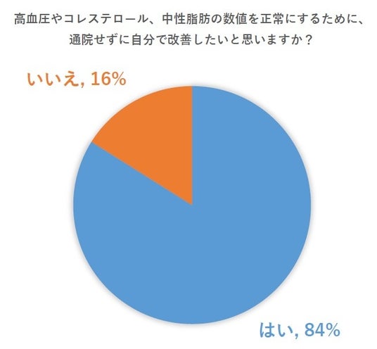 「高血圧やコレステロールの数値を正常にするために、通院せずに自分で改善したいと思いますか?」という質問には、84%が「はい」と回答。