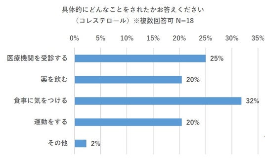 数値の高さを指摘された人は、どんな対策を行ったのでしょうか? 高血圧の場合は「食事に気をつける」と「薬を飲む」がともに29%。コレステロールは「食事に気をつける」が32%と最多でした。通院や服薬をしながら、自分でできることとして、食生活を見直している人が多いことがわかりました。
