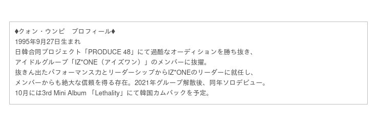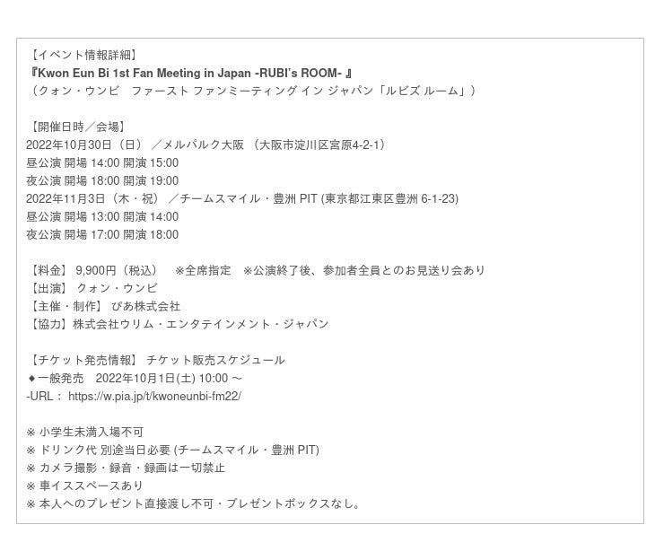 IZ*ONEのメンバーとして2018年に韓国デビューし、現在はソロで活動するクォン・ウンビの日本初ファンミーティング『Kwon Eun Bi 1st Fan Meeting in Japan ‐RUBI’s ROOM‐ 』のチケットが、 10月1日(土)午前10時より一般発売を開始した。また、同時にこのファンミーティング用に撮り下ろされた新たなビジュアルも公開。今回のファンミーティングのコンセプトである、彼女の部屋に招かれたRUBI(読み方:ルビ ※ファンの呼称)達を出迎えてくれているかのような優しい眼差しを向けてくれるロングヘアのウンビは、洗礼された美しさと圧倒的な存在感を放っている。