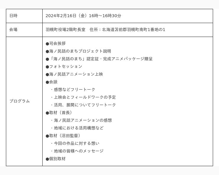 一般社団法人日本昔ばなし協会と日本財団が取り組む「海ノ民話のまちプロジェクト」は、日本中に残された海にまつわる民話を発掘し、その民話のストーリーとその民話に込められた「想い」「警鐘」「教訓」を、親しみやすいアニメーションとして映像化する事業です。この度、北海道羽幌町を舞台にした海ノ民話アニメーション「島の天狗さま」が完成したため、2月16日(金)にアニメ監督が羽幌町を訪問し、アニメのお披露目と「海ノ民話のまち」認定式を実施しました。このイベントは、次世代へ豊かで美しい海を引き継ぐために、海を介して人と人とがつながる“日本財団「海と日本プロジェクト」”の一環で実施しています。