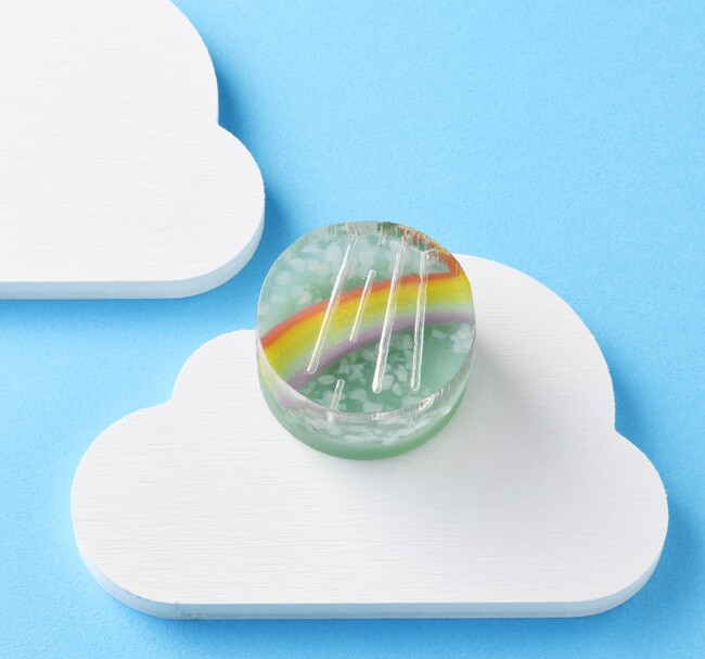 空に見立てた錦玉羹に、道明寺で雲を、そして色鮮やかに重ねたこなし生地で雨上がりの虹を表しました。目にも清々しいお菓子です。