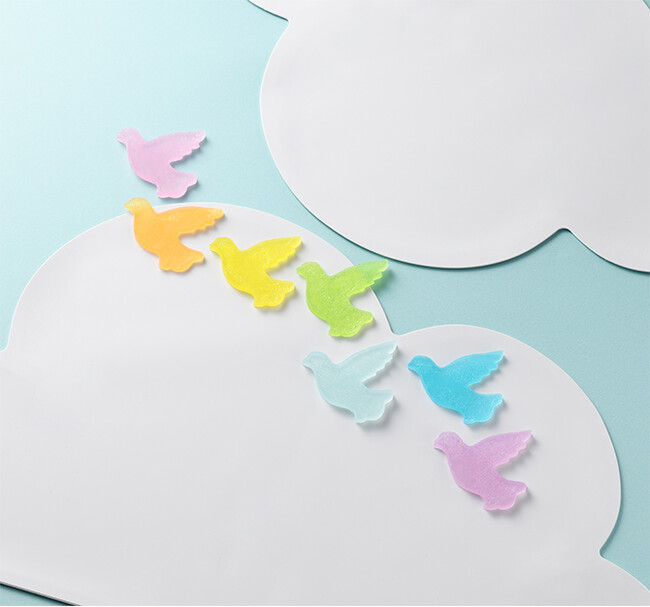 空にかかる美しい虹を、七色の鳩形の錦玉で表現しました。その姿はまるで、彩り豊かな未来へ飛び立つよう。