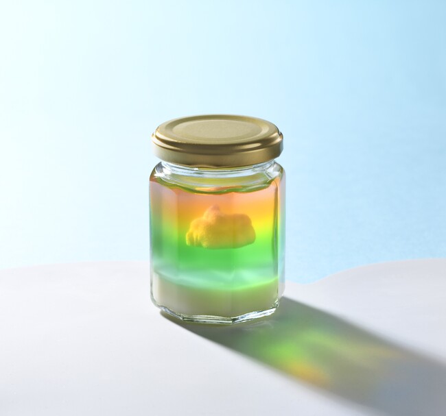 甘酸っぱいフルーツの美味しさで仕上げた錦玉羹を、雲に見立てたミルク味の淡雪と一緒に、瓶に閉じ込めました。そのままスプーンでお召しあがりください。