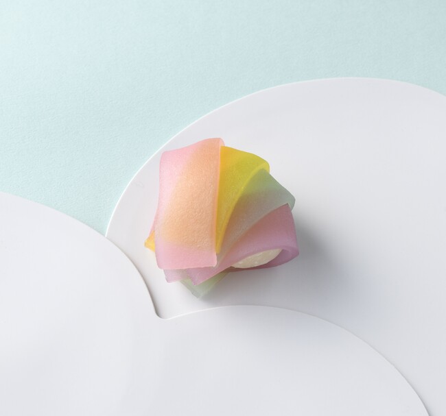 優しい甘さの餡を白い雲に見立てた求肥で一包み。雲の上に壮大に架かる虹を帯状に重ねた羊羹で“なないろ”に見立てました。