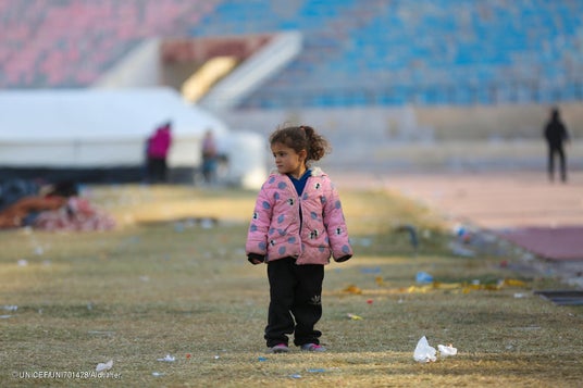 厳しい寒さの中、アレッポの戦闘から逃れて、家族とともにラッカ市の一時避難施設に到着したばかりの女の子(シリア、2024年12月4日撮影) (C) UNICEF/UNI701428/Aldhaher