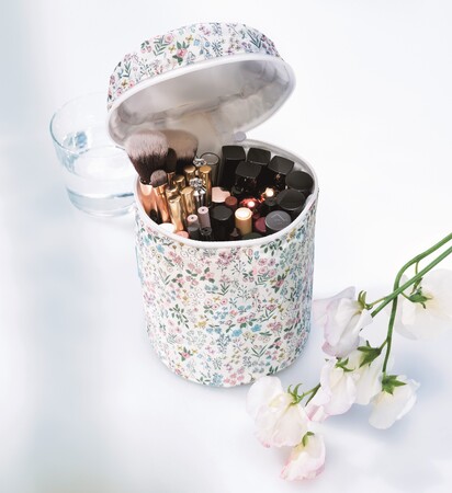 一番のこだわりポイントは、大容量且つ筒状のため、ボトル型のスキンケア用品現品やブラシなどを、そのまま縦向きに入れられる点。持ち運びにはもちろん、お家での収納にも。