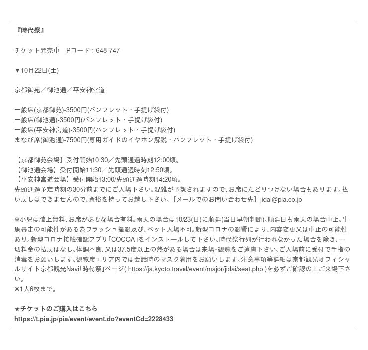 この行列をゆっくりと楽しむことができる有料観覧席が、京都御苑、御池通、平安神宮道に設置される。「行列が間近で見られる」「隣との距離が確保できて安心・安全」「ゆっくりと座って鑑賞できる」「伝統行事の保存・継承に役立てられる」というメリットに加え、「時代祭パンフレット」と「オリジナル手提げ袋」が付いてくる。また、チケットぴあのみで販売されているまなび席は、京都観光に精通する株式会社らくたびの講師によるイヤホン生解説付き。