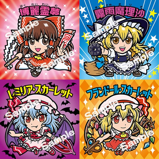 霊夢、魔理沙、レミリア、フランの4キャラ、それぞれ48mm角/98mm角の大小シールのセットです。