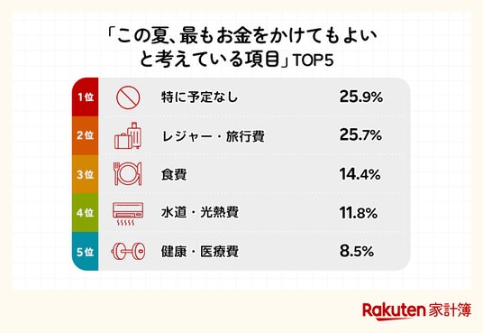 この夏、最もお金をかけてもよいと考えている項目について質問したところ、「特に予定なし」(25.9%)が最も多く、次いで「レジャー・旅行費」(25.7%)、「食費」(14.4%)、「水道・光熱費」(11.8%)、「健康・医療費」(8.5%)という結果になりました。「衣服費」や「美容費」など自己投資の項目は回答数が少ない傾向にあり、日々の生活や夏休みのイベントを優先的に考えている人が多い傾向がうかがえました。