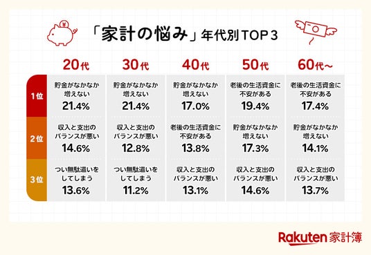 ・20~40代は「貯金がなかなか増えない」、50~60代以上は「老後の生活資金に不安がある」が最多の悩み