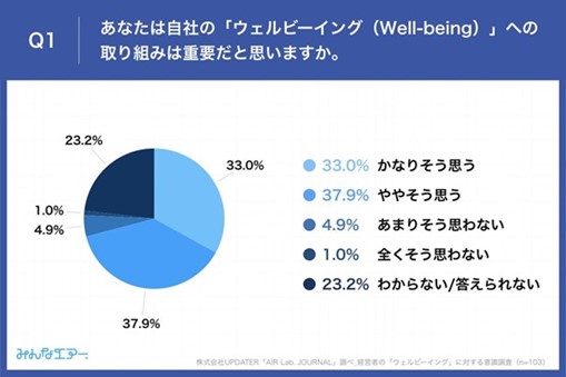 株式会社UPDATER「AIR Lab JOURNAL」が行なった、経営者のウェルビーイングに対する意識調査によると、ウェルビーイングに取り組んでいる企業の75.4%が「従業員の幸福度が目にみえるように変化した」と回答した結果も出ています(以下のグラフ参照)。