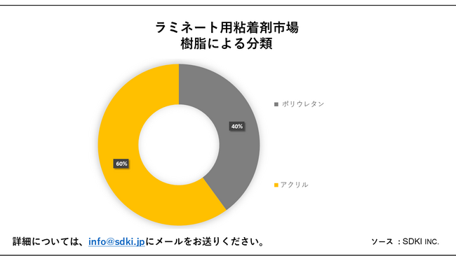 樹脂に基づいて、ポリウレタンセグメントは、2035 年までに最大の市場シェアを保持すると予想されます。ポリウレタンの需要は、包装、繊維、自動車と輸送、電子機器などのさまざまな用途での需要の増加により、増加すると予想されます。例えば、ポリウレタンは耐久性、耐荷重性、耐引裂性に優れているため、自動車、エレクトロニクス、家具、包装などの分野で利用されています。推計によると2019年には世界で1800万トン以上のポリウレタンが消費され、2024年には2200万トン以上が消費されると予測されています。さらに、ラミネート用粘着剤にアクリル樹脂を使用することで、優れた透明性、さまざまな環境変数に対する耐性、配合の多様性、さまざまな基材への優れた接着性など、多くの利点もあります。