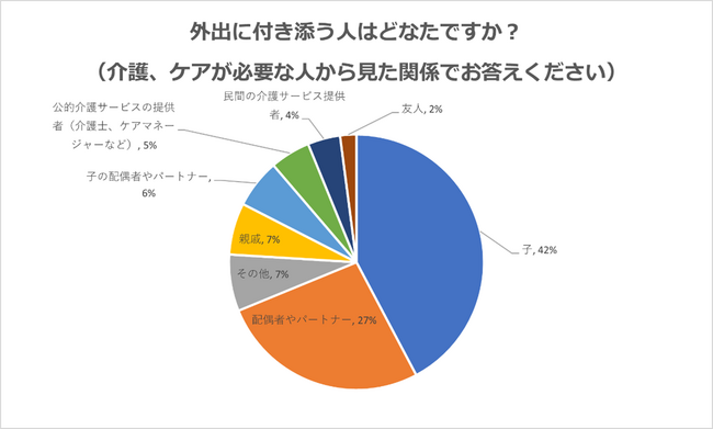 また、「よく外出する」「たまに外出する」と答えた人の中で、外出に付き添う人としては、「子」が42%と最も多く、次いで「配偶者やパートナー」と答える人が27%で多い結果となりました。