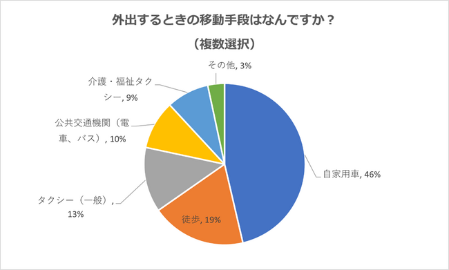 移動手段としては、過半数近くの人が「自家用車」と回答しました。次いで、「徒歩」と答える人が19%を占めました。