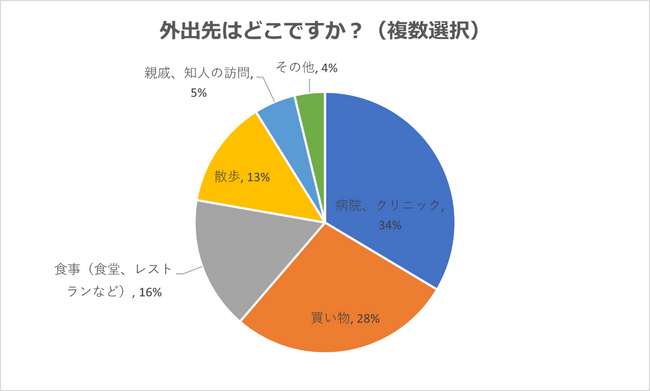 「よく外出する」「たまに外出する」と答えた人の内、最も多い外出先は「病院、クリニック」でした。健康上の理由で外出している人が多くいる現状を窺い知ることができます。次いで、「買い物」「食事(食堂、レストランなど)」の順番で多い結果となりました。