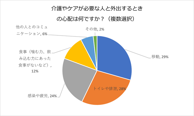 「移動」と、「トイレや排泄」がほぼ同じ割合で多い結果となりました。「感染や疲労」と答える人も三番目に多く、昨今の新型コロナや、インフルエンザの流行を不安に感じている人が多くいるとみられます。