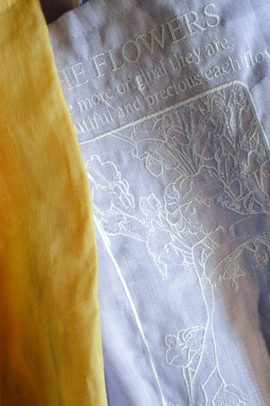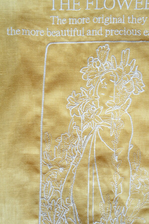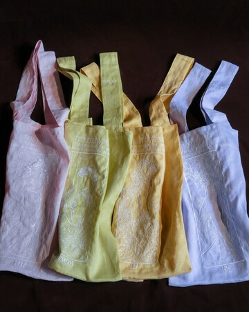 ミュシャの四連作“The Flowers”[四つの花]とミュシャからのメッセージを刺繍で描いたマルシェバッグ。春の訪れを祝福するような発色の美しいリネン素材は使うほどに柔らかく馴染んでゆく風合いが魅力で様々なライフスタイルに寄り添います。