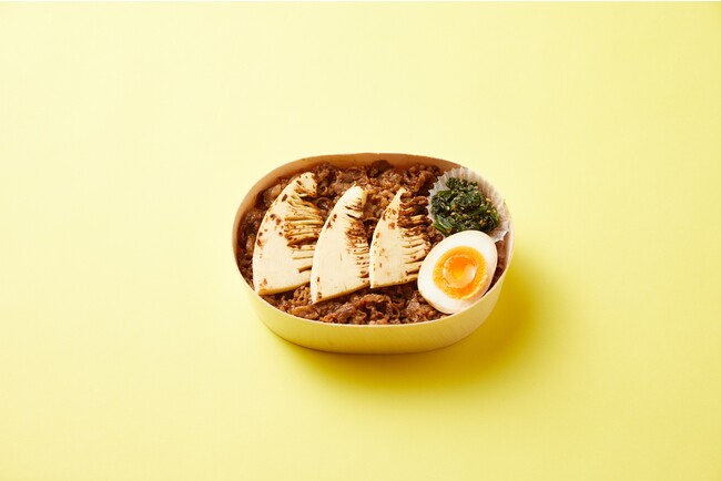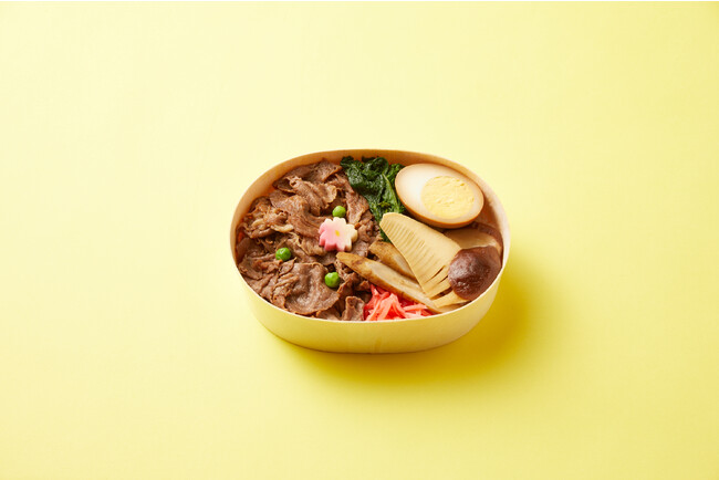 国産牛と筍を秘伝のたれで炊き上げた牛めし。筍はやわらかい食感を演出するため、穂先のみを使用。卵は甘辛く味付けした煮卵に、ほうれん草の胡麻和えを添えました。