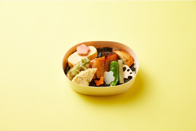 店内厨房で巻き上げた出汁巻きにふっくら焼き上げた銀鱈を用いたのり弁です。見た目も華やかに一折に仕上げました。