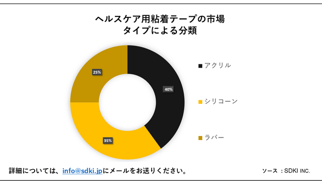 タイプに基づいて、2035年にはアクリルタイプが最大の市場シェアを占めると予想さ れます。このタイプは、事故や怪我の頻度が高まっていることから、企業での需要が高まると予想されます。インドでは、2021年に4,12,000件以上の交通事故が発生し、1,53,000人以上の死亡者と3,84, 000人以上の負傷者が出たと推測されています。しかし、シリコーンヘルスケア用粘着テープの使用量の増加により、シリコーンヘルスケア用粘着テープ市場は最も速い速度で成長すると予想されます。