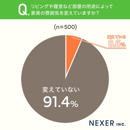 その結果「変えていない」と回答した方は91.4%にのぼり、「変えている」と回答した方はわずか8.6%でした。9割以上の方が、部屋ごとに家具の雰囲気を変えることはしていないようです。