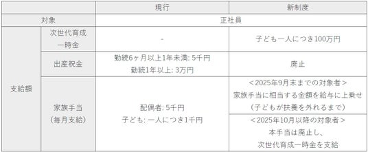 今回の新制度は、正社員本人または配偶者(内縁の場合も含む)が出産した場合、子ども一人につき100万円を支給するものです。昨今の物価高騰など、厳しい社会情勢においても従業員に安心してライフプランを描いてもらいたいとの願いから導入を決定しました。
