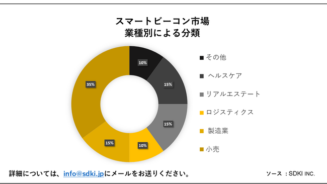 コンポーネントに基づいて、2035年末には、ハードウェアセグメントが最大の市場シェアを占めると予想されています。ビーコンのハードウェアは、どんな場所にも簡単に設置することができ、複雑さも最小限に抑えられます。ビーコンの需要は、ロケーションベースのアプリケーションやサービスに高い関心があるため、小売、輸送、物流など、複数の業界から高まっているようです。報告書によると、2019年のスマートビーコン市場では、ビーコンハードウェア分野が最も高いシェアを占め、市場全体の70%以上を占めました。