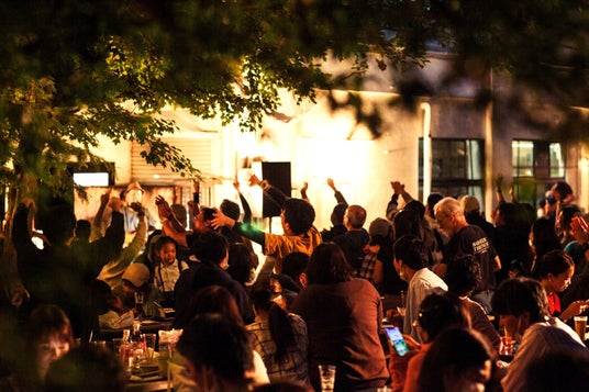 朝10時30分から夜20時まで、飲んで食べて笑って。中庭で行われるライブは、夜になるほど大いに沸き、ひとつに。
