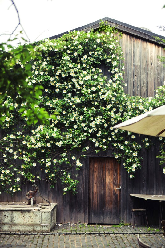 1919(大正8)年の酒蔵の壁は、4月になるとナニワイバラが満開に。
