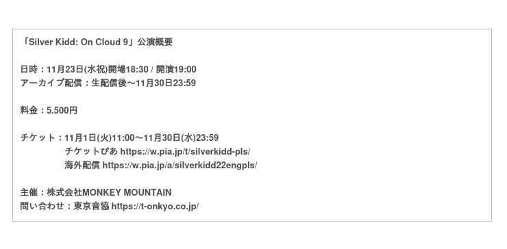 「Silver Kidd:On Cloud 9」チケット https://w.pia.jp/t/silverkidd-pls/